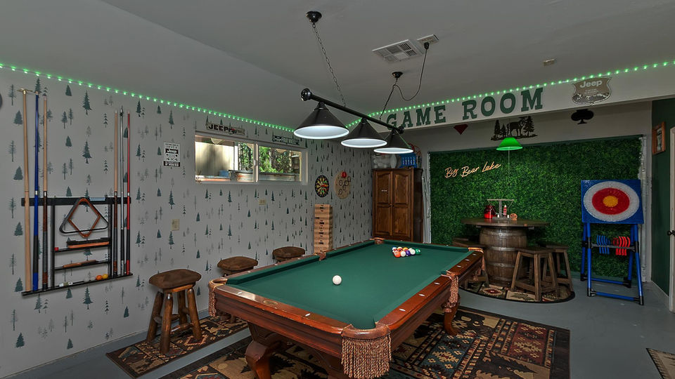 4 Bedrooms, 2 Baths, Full-size Kitchen, Living Room, Fireplace, Dining Area, Game Room, Spa, Fenced Backyard, BBQ Grill, and located within walking distance of the Snow Summit Ski Resort.